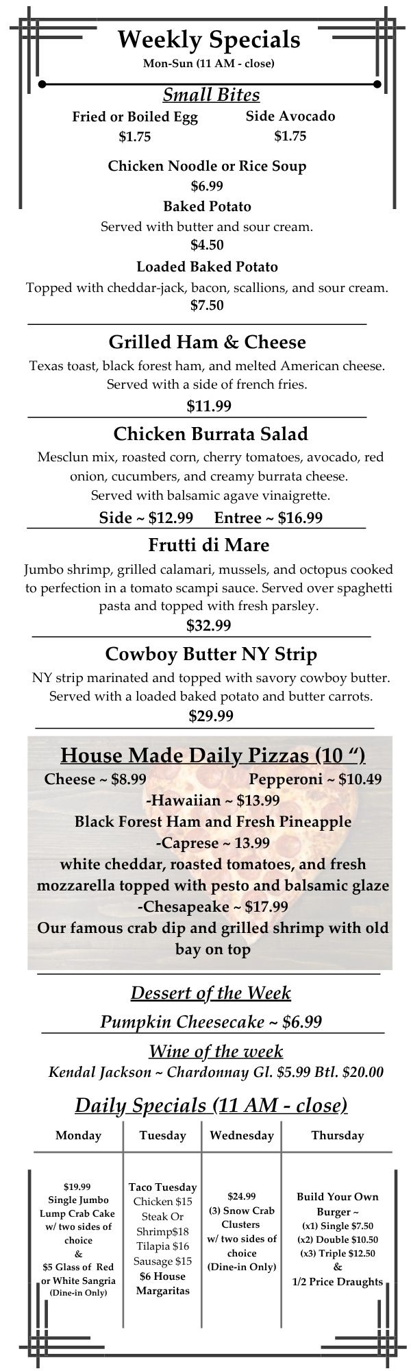 Cheese~$8.99 Pepperoni~$10.49 Caprese~$13.99 Hawaiian~$13.99 Chesapeake~$17.99 ( 10″ Pizza)