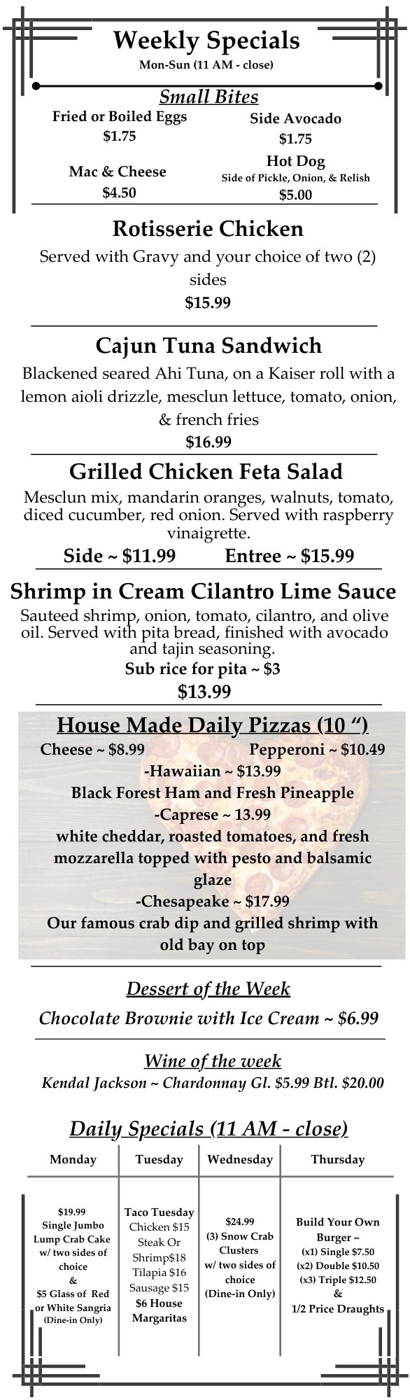 All Day Menu Lunch Menu Weekly Specials Happy Hour Kids Menu Gluten-Free Menu Catering Menu Drink Menu Seasonal and holiday menus available on certain days. See our events page for details!